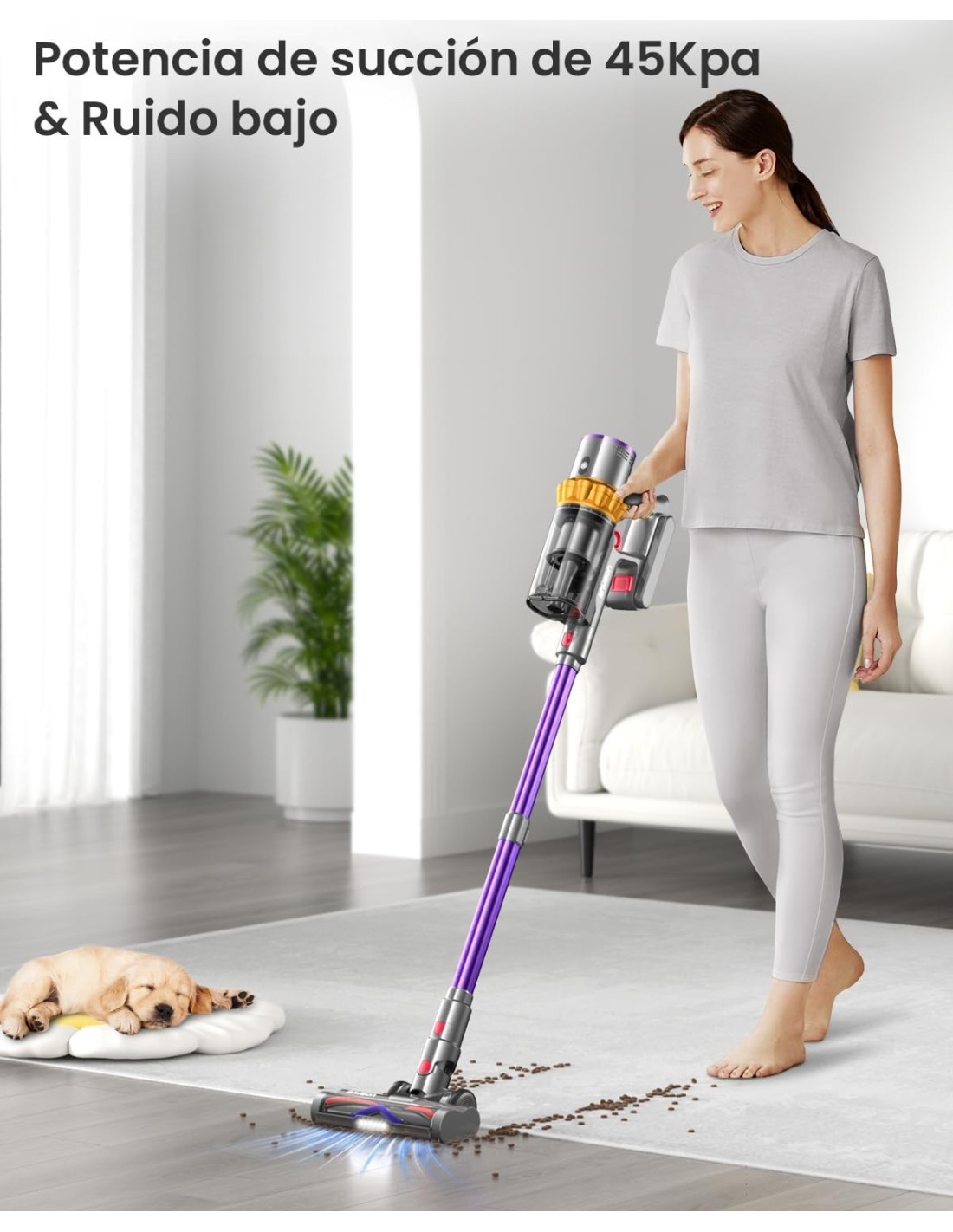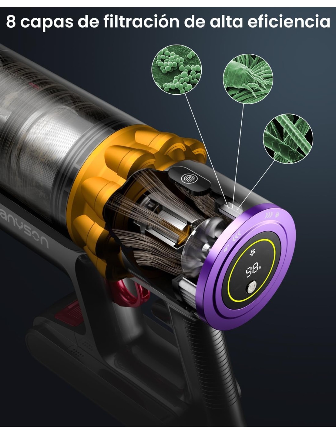 Compré esta aspiradora principalmente porque en casa somos muy sensibles al polvo y tengo un hijo con alergias, así que necesitábamos algo realmente eficiente, no solo para limpiar lo que se ve, sino también para mantener el aire lo más puro posible. Y la verdad: ¡esta aspiradora ha sido una excelente elección!Lo que más me convenció fue su sistema de filtración de 8 etapas, que incluye filtro HEPA. Desde que la usamos, he notado una mejora en la calidad del aire; ya no sentimos ese ambiente “polvoriento” después de aspirar, algo que sí nos pasaba con otras aspiradoras. Incluso los olores en casa se han reducido, especialmente en las zonas donde duerme nuestra mascota.La potencia es impresionante (45Kpa) y el depósito de 1.6L es enorme, así que puedo limpiar toda la casa sin parar a vaciar. Además, la batería dura muchísimo, casi una hora sin bajar la potencia, lo cual es perfecto para hacer limpiezas completas de una sola vez.Me encanta también lo práctica que es: la pantalla táctil LED me permite ver todo fácilmente y la base de carga automática mantiene todo ordenado y siempre listo para usar. Es ligera, fácil de maniobrar, y llega bien debajo de muebles y rincones.En resumen, si te preocupa el polvo fino, los alérgenos o simplemente quieres respirar mejor dentro de casa, esta aspiradora es una gran inversión. Cómoda, potente y, sobre todo, pensada para cuidar la salud de quienes vivimos en el hogar.