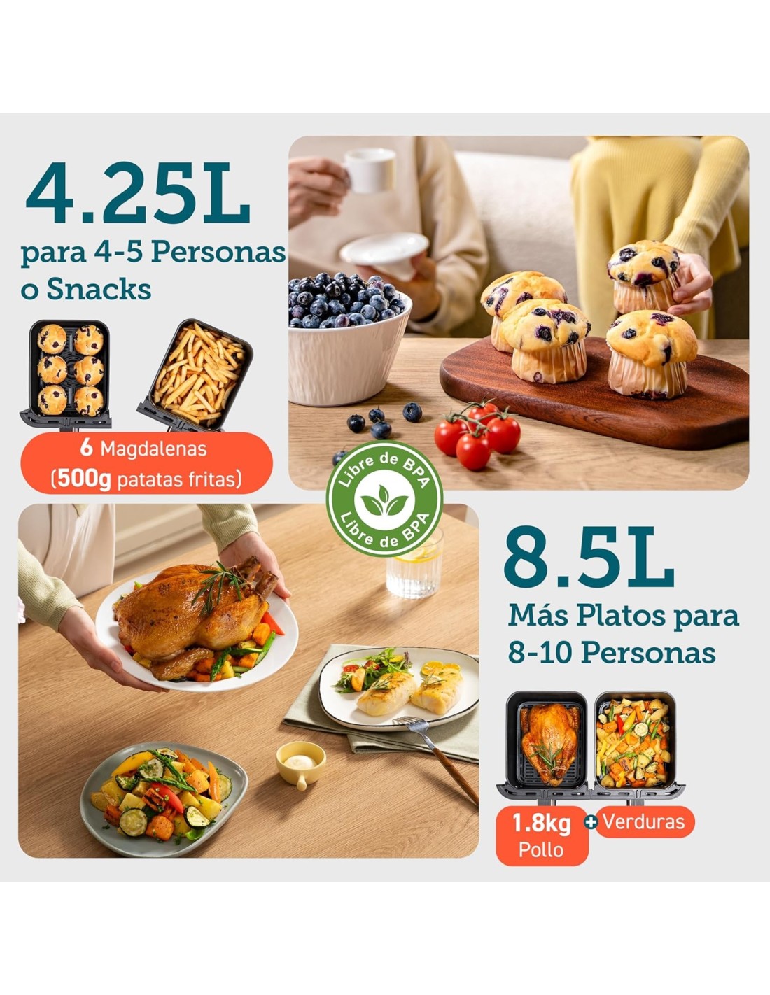 Cosori Freidora de Aire Grande con Doble Cesta 8,5L Air Fryer, Alta Pontencia y Velocidad, Max 8-10 Personas, 10 Funciones,